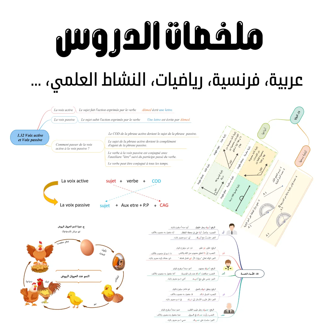 - القسم الثاني: ملخصات الدروس — اللغة العربية، الفرنسية، الرياضيات، النشاط العلمي.